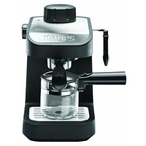Easy to operate steam machine. Glass carafe with lid and handle is ideal in the preparation of popular espresso drinks, keeps espresso warm while frothing milk for cappuccinos and lattes. Removable metal drip tray. Steam nozzle quickly froths milk and is easily controlled by oversized dial. Illuminated On/Off switch. 800W. Dimensions: 11'' H. x 8.5'' W. x 9.38'' D. Black/silver.